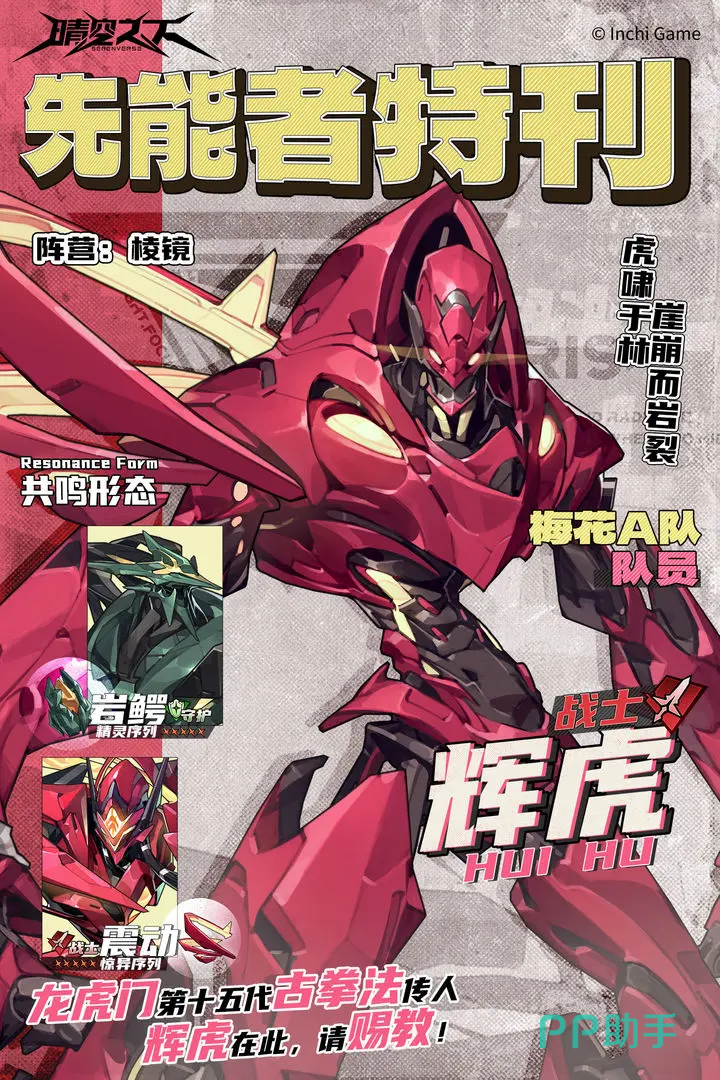 战士定位的英雄,变身形态非常帅气,非常纯粹的战士,面对诸多敌人,都有钢筋铁骨般的拳脚功夫。1技能“猛虎拳”,对目标造成大量攻击伤害,并触发“虎印”效果。2技能“裂云眼”,使出强力的连环踢技,敌人受到大量伤害,并给敌方目标施加“创伤”效果。3技能“钢筋铁骨”,他坚硬的躯体,具备比更强的破坏力。