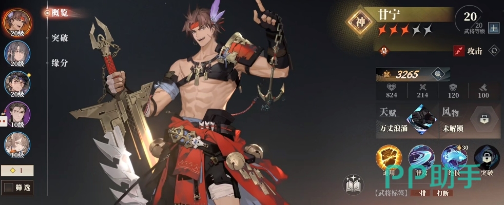 甘宁作为高爆发刺客,拥有多段攻击能力,可顺利打断敌方技能,不过它的输出上并不稳定。