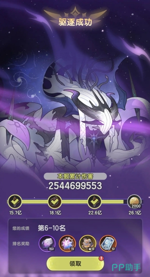 混沌侵袭所能为玩家带来的奖励主要分为两种,一是全服只要参与了活动的玩家都能拿到的驱逐奖励,只要活动累积的伤害数值达到一定的阶段,就能解锁对应阶段的奖励,并把该奖励发放给玩家。另一种则是根据输出排名来发放的个人奖励,不同名次的玩家所能拿到奖励都不一样。