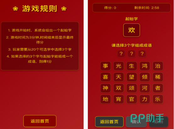 此游戏是属于考验玩家成语水平的,可通过玩这样的游戏,来增加这方面的能力。开局会给出起始字,需要在规定的时间内,选出三个字,搭配成成语就可以获得1分。游戏的主要特点就是,会给出20个字的提示,可通过观察20个字,与给出的文字,所包含的联系完成填写。更适合在节日以及很多环境当中,与家人朋友共同玩这样的游戏,比拼智慧。