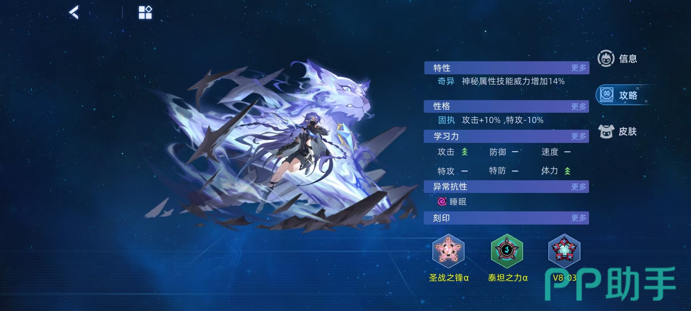 精灵的培养和玩法上都要围绕着自身的属性和特性来展开,这个精灵的体力170,攻击141,速度138,可以说非常优秀,而且是围绕着攻击来进行输出。自身的专属特性,使自身攻击技能命中时,可吸取对手身上的能力,自身属性技能命中时,可吸取对手所有技能的pp值。在特性选择方面,推荐奇异,可增加神秘属性技能的威力。性格推荐固执,攻击增加10%,特攻减10%,学习力先去堆满攻击,然后再堆体力。