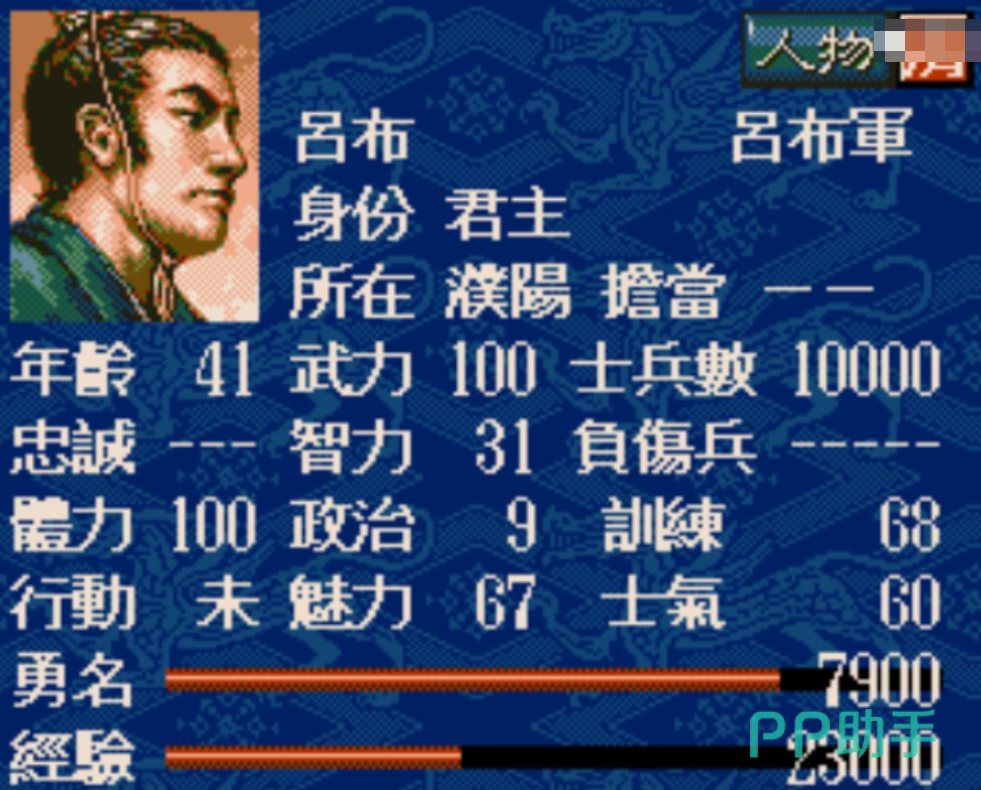吕布在三国志5中堪称战神级存在,武力高达102,是全游戏唯一突破100大关的武将。在单挑系统中,几乎无人能敌,能在数个回合内击杀绝大多数武将。此外,其统率值亦达95,使他不但擅长单挑,也能带兵作战。在实战中,吕布骑兵属性极高,率领骑兵冲锋时威力惊人。虽然智力偏低(仅40左右),但可以通过搭配高智力军师来弥补其战略短板。唯一的缺点是忠诚度较难维持,需要注意人事安排,但总体而言,吕布是最强的前线主将人选。
