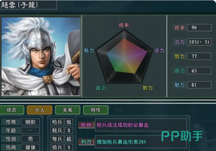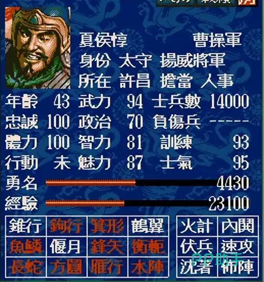 这是游戏里面非常擅长用兵的一个武将。速攻对于他来说是最为实用的技能,在学会了锥行的情况下,速度可以有更上一层楼的效果。他可以说是能攻能守能团的存在,鹤翼阵时团战的神器,“远射”使他可以攻击射程比较短的敌人,“火箭”这个技能更是让他的攻击力得到进一步的提升效果,“奋发”可以在敌方中心直接“开花”,“伏兵”这个技能对于一些智力比较低的敌将有较好的发挥作用。会使用防御神阵以及方圆阵,在搭配无双,即便是在城中,也能坦然的等待援军,稍显不足的就是缺少回射,同时智力属性不是特别的高。他的寿命比较长,到三国鼎立时期差不多就能搭配出T1的阵容,如果加一把剑更是能达到T0级别的,还是非常值得培养的武将。
