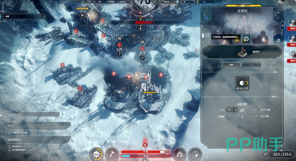 资源管理的关键在于平衡炭窑产能与核心设施消耗。由于炭窑的煤炭产出效率低于煤矿,需优先保障发电局、蒸汽塔等关键建筑的能源供应,暂时搁置非必要设施(如温室、高级工厂)。当面临极端低温时,可选择性关闭部分非核心区域的供暖,集中资源保障生存必需设施。此外,探索队需积极外出搜集木材与煤炭资源,尤其是废墟中的零散煤堆,可通过收集站自动归集,作为炭窑产能的补充。