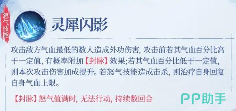 姬如雪的核心技能是怒气技灵犀闪影锁定敌方血量最低目标造成高额单体伤害,高血量敌人概率被封脉(禁用怒气1回合),低血量敌人则受到额外伤害加成,击杀后还能回复生命值。普攻素心霜刺攻击后排随机2人,对术法职业有额外伤害,适合针对法师阵容。天赋冰魄凝魂让她在击杀后追加一次追击,觉醒后追击伤害提升30%,大幅增强收割能力。突破技霜天雪舞则能提升全队攻击力并附加冰系易伤,增强团队输出。