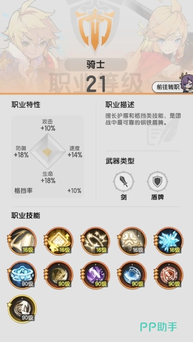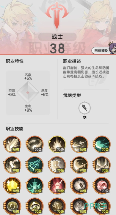 一转后的斗士,主动技能包括提升暴击率的战意沸腾、用于范围四段连击清怪的旋风斩、无冷却单体三连击补刀的狮子连斩,以及三转核心技能夕照剑舞,该技能拥有五段范围伤害,但需要高暴击属性支持,被动技能中剑风缠绕是连击流的核心,可使连击触发风属性伤害,成为主要输出手段,一转骑士的主动技能同样各具特色,守护之环能依据自身防御力百分比为自己或队友施加护盾,保障生存,被动技能里,矢量回弹是格挡反伤流核心,成功格挡时能依据自身防御力加成对敌方造成伤害,格挡意识增加格挡率与格挡减伤,金汤铁壁为自己和队友提供伤害抵抗。
