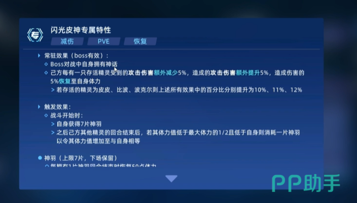皮神的获取需通过挑战创世神力-神兽之威关卡,收集创世之羽来兑换,该关卡涉及对四神兽的挑战,且挑战顺序会影响皮神最终特性,皮神自身拥有强大的魂印效果,在BOSS战中具备神话特性,可免疫异常状态、能力下降以及特定技能特效,所有技能必定命中,魂印还会依据己方存活精灵数量提供额外减伤,并将部分伤害转化为自身恢复,面对皮神不同特性,打法也有所不同,当皮神特性包含必先时,玩家可利用帝皇之御的守御八方技能获取两次必定先手权,随后让1级的六界帝神消耗1次必先释放剑挥四方进行弹伤,最后由时空界皇等补刀手消耗第二次必先完成击杀。