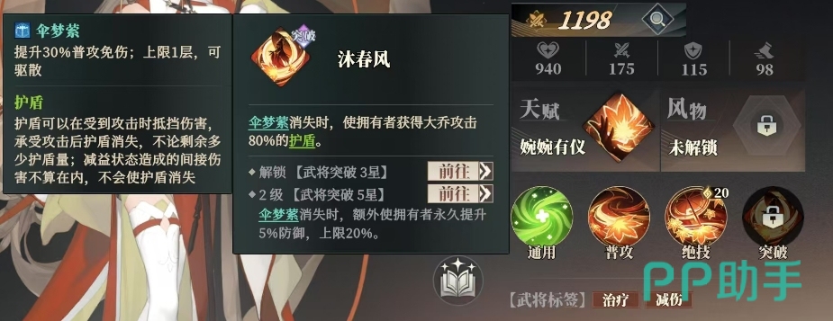 乔姝还拥有一个独特的突破技能叫做沐春风,这个技能是当带有伞梦萦增益状态的队友受到攻击导致该增益消失时,沐春风技能便会触发,此时乔姝会为失去增益的队友提供一个相当于自身攻击力80%的护盾,而当乔姝达到突破5星时,沐春风技能会有升级后的效果,在这种情况下,每当伞梦萦消失时,除了给队友提供护盾外,还会额外使拥有者永久提升5%的防御力,这一效果最多可以叠加20%,所以就算团队当中的防御角色不好用了,也可以先用大乔挡一挡哦。