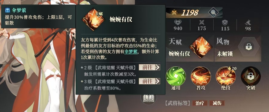 而乔姝的绝技,更是将她的辅助能力发挥到了一个新的高度,这是一个强大的群体治疗与防御增益技能,当乔姝在战斗中释放相思雨时,可以为所有友方角色带来生命的恢复,她能够为全体友方治疗相当于自身攻击力79%的生命值,瞬间提升团队的整体血量,不仅如此她还会给队友添加一个名为伞梦萦的增益状态,这个状态将持续2回合,在这2回合内处于伞梦萦状态下的队友,其普通攻击免伤能力将提升30%,团队都可以减少自己所受的伤害,增强团队的续航能力。