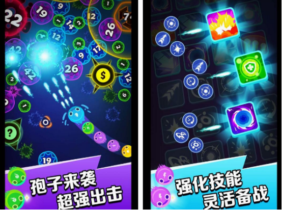 这款叫做孢子战争的手游,既是一款单手就能操作,采用竖屏的方式进行设计,还会遇到孢子战争为主的游戏世界中,需要通过极限的多位灵活的操作模式,展开合成以及进化,更能在玩的时候享受充满着割草的体验。在面对孢子来袭的过程中,需要利用超强的出击以及强化的技能,展开灵活的备战,可以在战争当中战胜孢子。