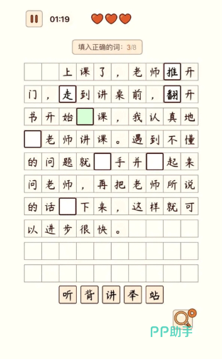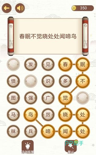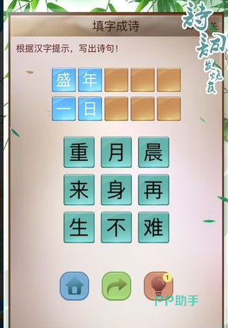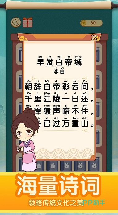 这是一款兼具趣味与学习价值的游戏。玩家可以通过填写诗词空白来逐步解锁关卡。这需要玩家运用自己积累的知识来完成填空任务。游戏中不仅包含古诗词,还有成语供玩家学习,有助于提升玩家的知识储备。玩家可以通过点击的方式补充诗词中的文字,所有相关功能均可自由使用。并设有时间限制,玩家需在规定时间内完成挑战。学生可以利用这款游戏巩固所学知识,提升语文水平。