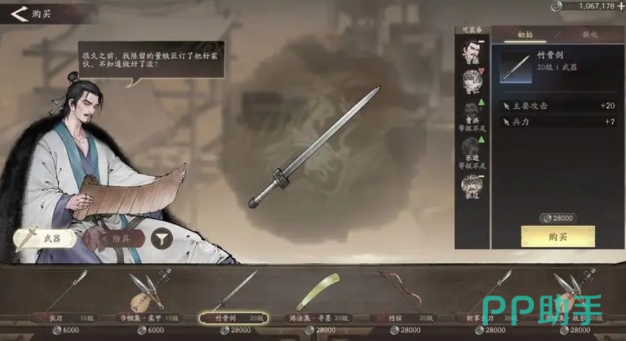 当玩家在游戏过程中不断积累经验、提升实力,将剧本等级逐步提升至20、30、35、40、45级后,便可在主界面点击建筑总览,然后从众多建筑中精准选择工坊建筑,进而对其进行升级操作,工坊完成升级后其出售的装备等级也会相应提高,在装备获取的过程中其实购买装备是一种较为直接的方式,玩家在装备获得界面的装备商店中挑选合适的装备后,这些装备能够直接穿到主将身上,迅速提升主将的战斗力。