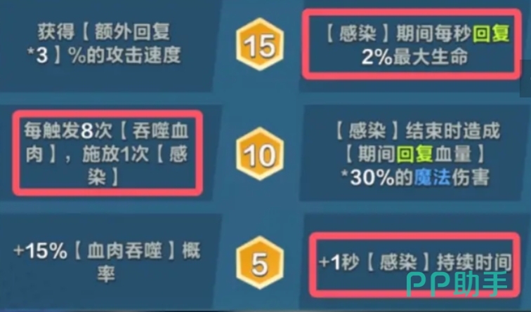 而到了15级选择感染期间每秒回复2%最大生命,这是给食尸鬼的回血能力带来增强,在感染持续的这段时间里,食尸鬼能够稳定地回复大量生命值,其实食尸鬼在没有护盾的对局中,回复能力是很不错的,在游戏的前期阶段玩家完全可以充分利用食尸鬼这种被动和大招所带来的回血优势,尝试去冲击连胜,而且通过10级天赋的加持,这种连胜的稳定性能够得到进一步的保证,在前期取得连胜后,资源会逐渐向食尸鬼倾斜,使其能够更快地成长起来。