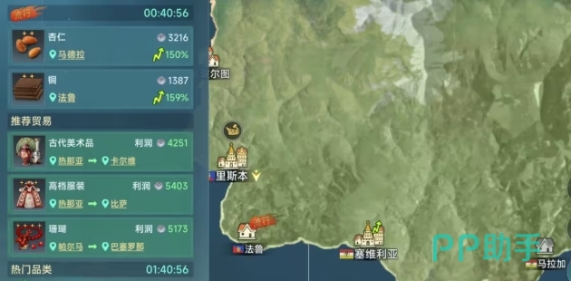 进入游戏世界后大家首先是跟随新手引导任务的,在此强烈建议新手玩家优先完成新手流行任务,以葡萄牙的新手流行为例,新手流行通常仅有两种,与正常流行相似,每两小时刷新一次,但总数限定为四种,这是游戏为新手玩家精心准备的福利,由于新手流行均位于玩家首都港口附近,完成它们将奖励大量星书,星书在游戏中是玩家在交易行购买商品后补充货物的关键道具。