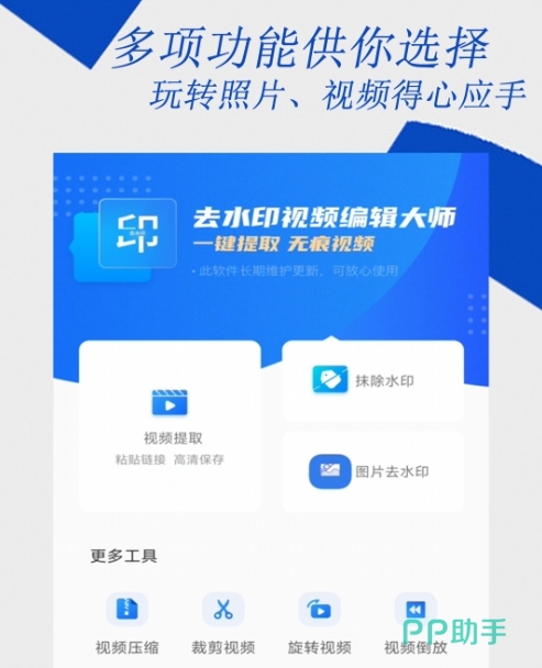 该软件具备了多种不同的功能,像照片、视频等方面的编辑也是可轻松实现,其中想要去为喜欢的作品去除水印,或者是把完成的视频分享给好友等都是可以的。