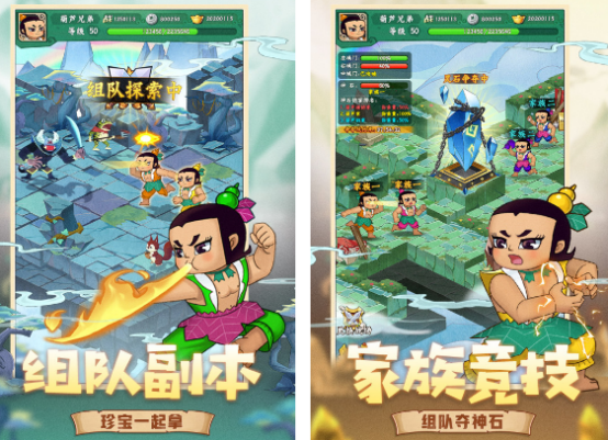 作为根据经典的葫芦兄弟所推出的手游,不仅集结了葫芦七兄弟,还能在游戏中,通过组队副本,与其他的葫芦兄弟展开战斗。通过以86年剪纸风格的动画片原型,所设置的手游,你还能看到动漫中的很多情节,和经典动画片中的内容。无论是想要通过轻松的挂机模式完成练级,或者是利用闯关的方式,获得奖励,这款游戏都有丰富的故事情节。