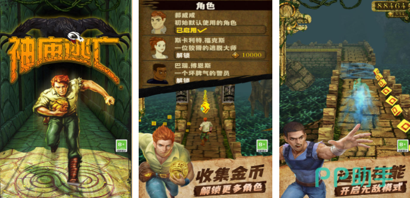 在神庙逃亡这个游戏里,会设定一个无穷无尽的迷宫,原本是想去神庙里寻找宝藏,但玩家意外被怪物发现,面对怪物的追逐只能沿着道路不断向前奔跑,在这个过程中,会出现很多左右向的道路玩家需要及时的滑动屏幕,调整人物的奔跑方向,除了怪兽的追踪之外,在游戏里还会出现大量的障碍,需要小心躲避,这样才能让角色顺利逃离神庙。