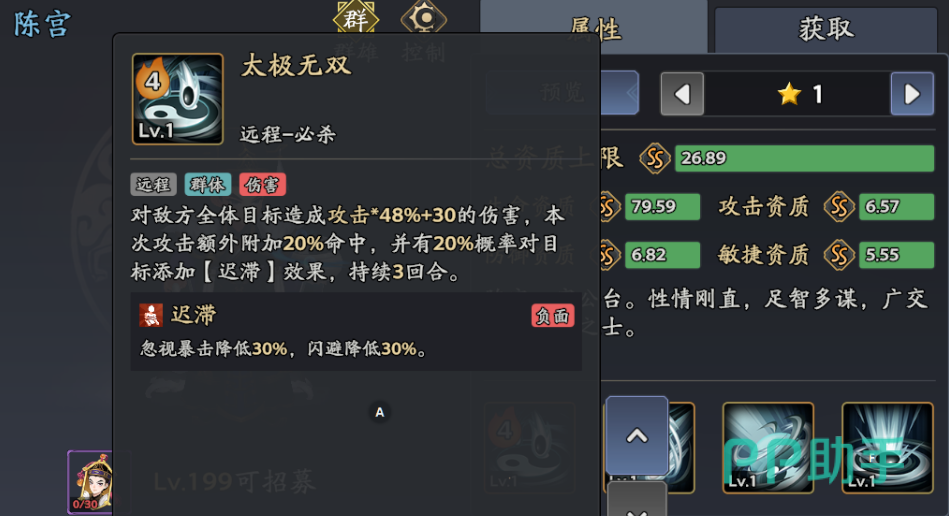 效果:全体48%攻击+30伤害,20%概率挂【迟滞】(持续3回合),附加20%命中提升。