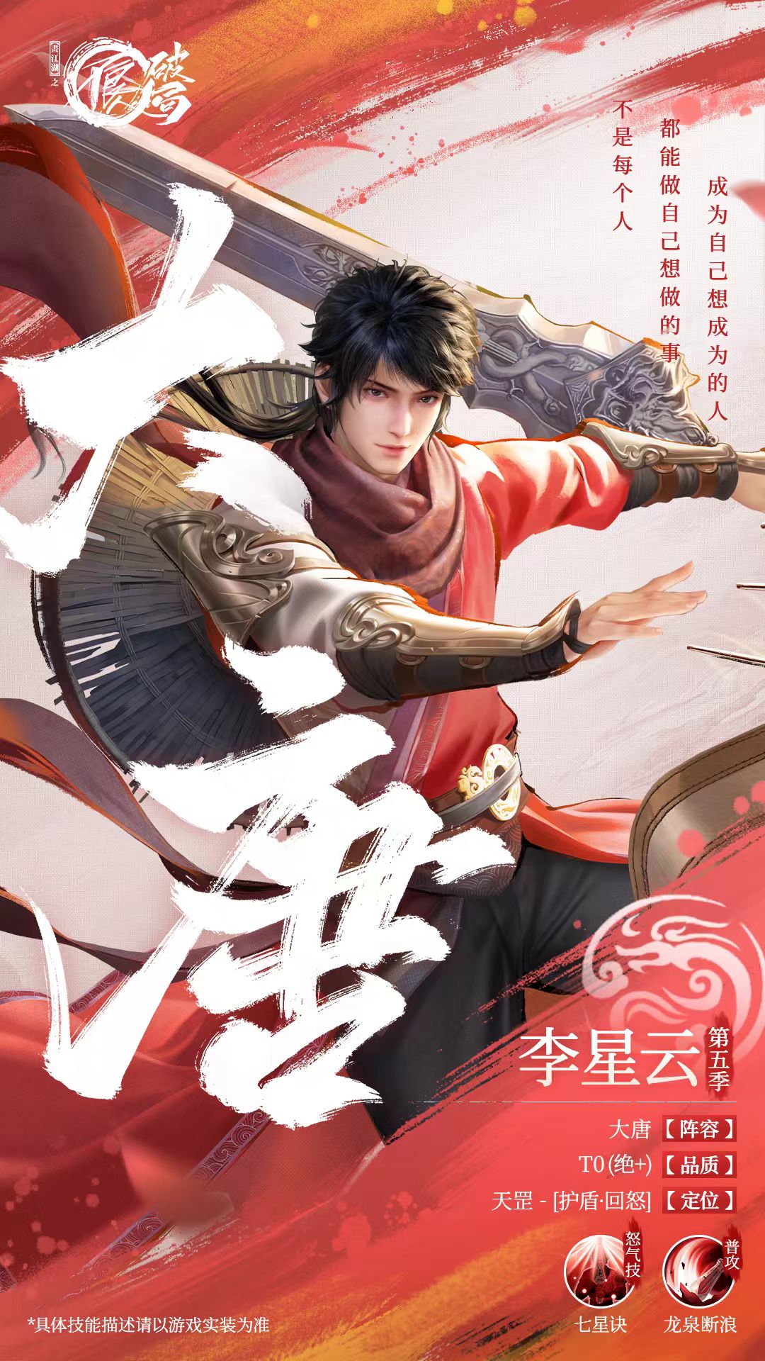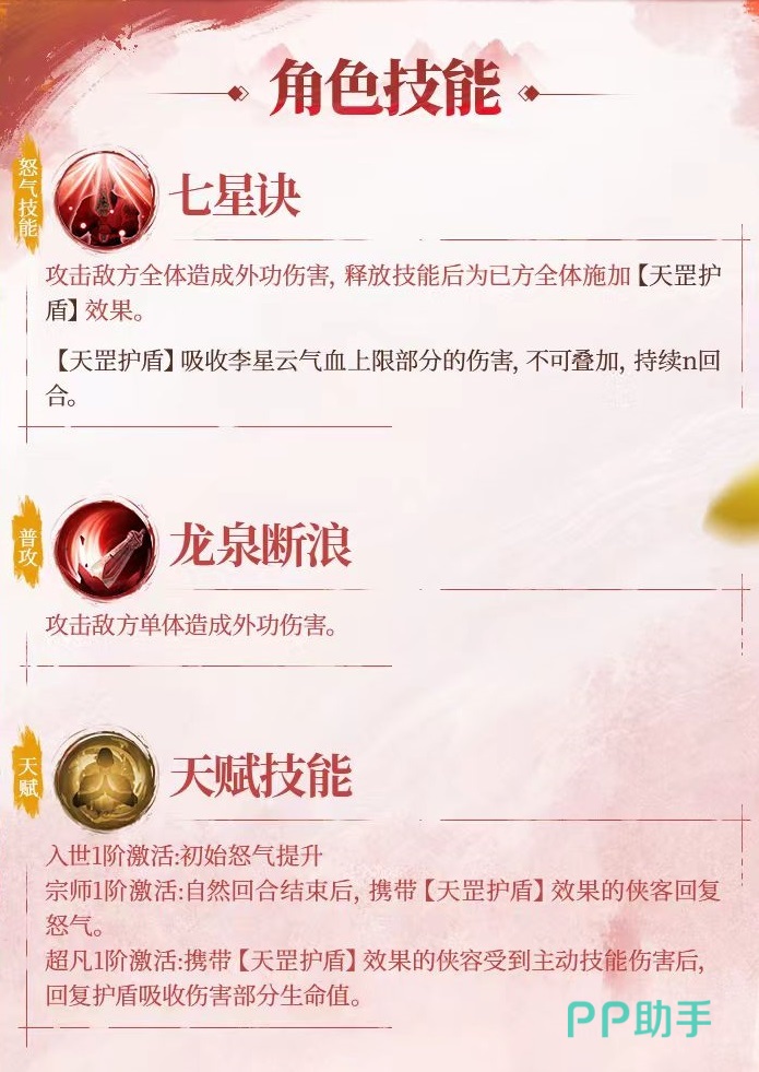 在游戏中,李星云起到了一夫当关的重要作用,它可以凭借自身怒气技能攻击敌方全体,还能够为己方附加护盾效果。既有输出又能提高友方的生存能力,还可以当做充电宝来恢复怒气值,所以说在功能方面非常齐全。自身的怒气技能七星诀,攻击敌方全体目标,造成外功伤害,在释放技能后,己方全体侠客将获得天罡护盾效果。在该护盾的影响下,可按照李星云气血上限的百分比来吸收伤害,护盾不可以叠加,能持续多个回合。