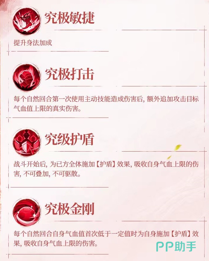 普攻技能龙泉断浪,选定敌方单体造成外功伤害。天赋技能所带来的效果包括初始怒气提升,在自然回合结束后携带天罡护盾效果的侠客可以恢复一定值的怒气,以及携带天罡护盾效果的侠客,在受到主动技能伤害之后,恢复护盾吸收伤害部分生命值。这样就不仅仅是群体伤害方面的能力,更是能够保护队友和提供怒气,方便整个团队加快输出节奏。
