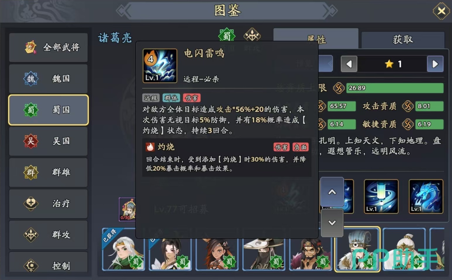 进行阵容搭配之前,首先大家要了解诸葛亮的特点,诸葛亮本身是属于蜀国阵营的群攻型角色,在资质方面比较出色。第1个技能电闪雷鸣,属于远程必杀类型,对敌方全体目标造成伤害,本次伤害能无视目标部分防御,并有几率造成灼烧状态,持续三个回合。对方被灼烧影响后,每回合结束都会受到持续伤害,并降低20%暴击率和暴击效果。