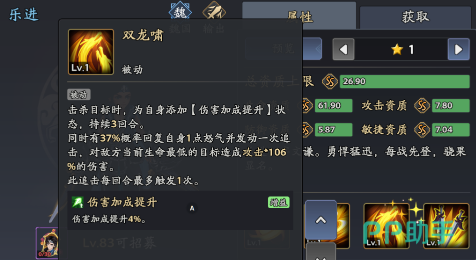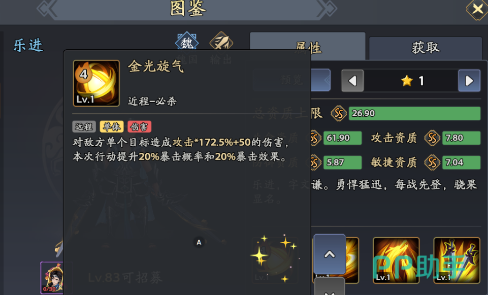 效果:单体172.5%攻击+50伤害,提升20%暴击率与暴击效果,27%概率无法被援护(升满后概率提升至50%)。