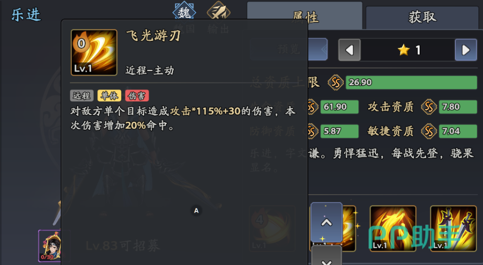 被动1是乐进输出循环的核心,升满后追击概率提升至60%,大幅增加收割效率;被动2直接强化大招机制,免援护与多目标追击是对抗高坦度阵容的关键;大招伤害随等级提升显著,满级的时候攻击可达到240%,建议升至高级解锁全额暴击增益,主动技在后期可以补上相应的等级。