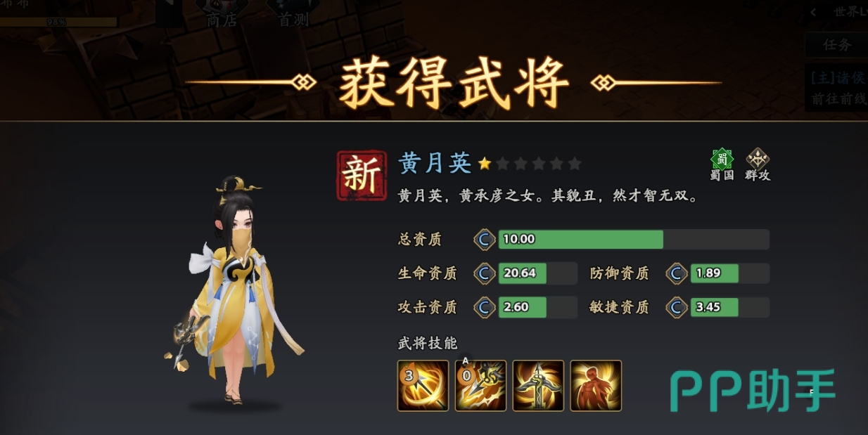 黄月英:美若天仙被动,提升技能伤害提高、命中提高,同时驱散概率,是功能齐全的群攻副C。