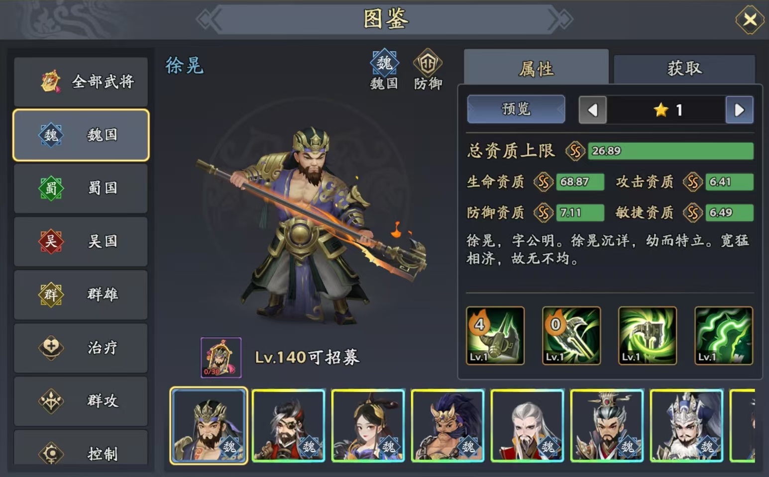 徐晃是属于魏国的防御型武将,利用自身的必杀技,可以做到群体伤害加控制等一系列效果。技能对竖列的敌方目标造成伤害,有几率附加中毒和石化,对方被中毒影响之后会削弱防御,并且在持续回合内受到中毒伤害,被石化后无法行动,伤害减免提高。徐晃的作用除了抗伤害之外,就是利用自身技能添加上中毒,所以队友搭配的时候也是以各种异常状态为主。徐晃自身的加点可以直接全加体力提高生存。