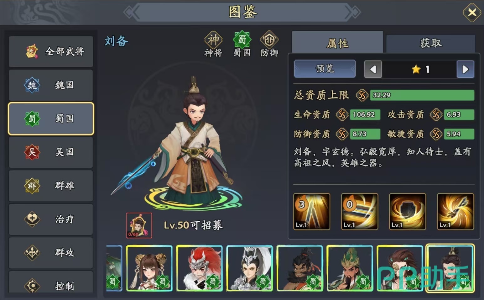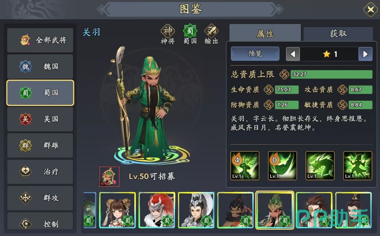 队友搭配方面选择的也都是以神将为主,首先是前排防御选择刘备,刘备的必杀技可以给自身和随机两个友方目标添加状态。在此状态下,受到攻击时所有人都会均摊伤害,免疫偷取效果,还能提高伤害减免。另外刘备能够对目标造成群体伤害和防御降低,提高其他人的输出。单体输出方面直接选择关于关羽,也是游戏里的热门角色,自身主动技能和必杀技都可以打出很可观的伤害,还有几率造成沉默等控制效果。