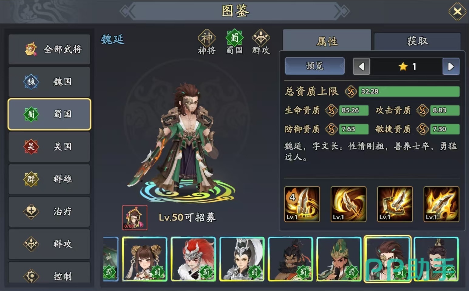 大家可以通过试炼之路等方式来获取魏延,这是属于蜀国阵容的群攻型神将。自身必杀技能可以对敌方以及左右两侧的目标造成伤害,本次伤害有几率将目标身上的增益状态驱散。另外三个全是被动效果,可以使普通攻击附带横扫,造成伤害时有几率对目标造成流血,以及按照目标生命上限去附加伤害等。所以说魏延的输出还是非常犀利的。为了让输出变得更加强势,加点方面当然是选择全武力。