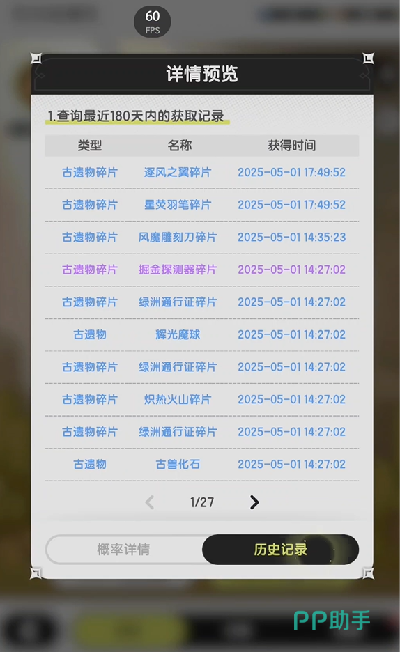 然后大家想要看一下自己获得的物品,也可以在抽奖记录中查看。直接点击详情预览中的历史记录就好,这时就会根据你抽取的日期出现对应的记录,不过会发现抽到的概率略低,所以不太建议大家将资源砸在这里。