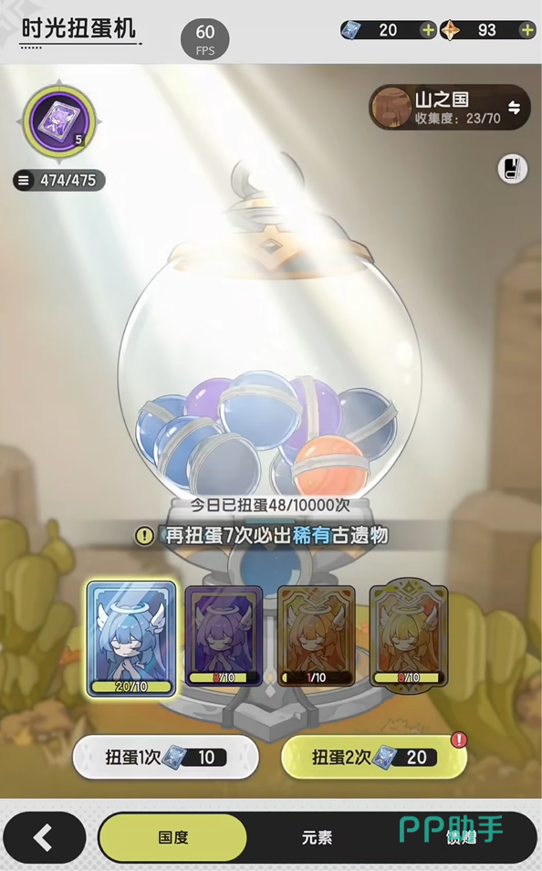 其实想要找到扭蛋机的话也很容易,只需要在游戏主页中往左边走,就可以看到一个偌大的扭蛋机,这时大家点击一下就可以进入扭蛋页面了。大家点击国度的话,就可以在这里抽取古遗物,这是装备的同城,可以为你的角色增加属性以及其他能力。