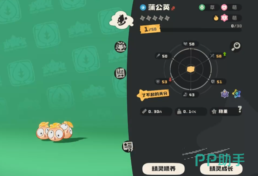 蒲公英娃娃是草系和萌系的精灵,属性方面比较均衡,生命和物防较为突出,速度比较慢。它的特性是在使用能耗大于3的技能时,威力可以提升40%。因为这个特性的存在,为了最大化效果,自然是尽量给配能耗3的技能。