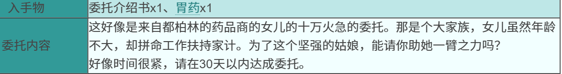 我们在接受该任务的时候要准备介绍委托书一份以及胃药一份,然后前往都柏林找到药品商的女儿,跟药品商女儿交谈3次,药品商的女儿遇到一件十万火急的事情需要寻求你的帮助,药品商的女儿来自于一个大家族,虽然她的年龄并不大,可是却非常的努力,是一·个非常坚强的女孩子,面对女孩在的委托,你最终决定接受她的委托。