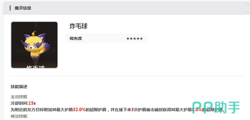 炸毛球:可以给附近的友方成员全部增加32%的超限护盾,并且在接下来的三次护盾被击破时,还可以得到一个8%的超限护盾。另外还可以有效获得16%的雷属性攻击,从外形上来看应该就是一个毛茸茸的球体。在触发技能之后,毛发就会炸开,呈现出一种特效光芒。