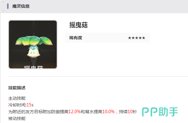 摇曳菇:这就是游戏中可以获得的魔灵,可以给附近友方目标的成员提升12%的防御,而且在持续10秒内都有效果。还可以增加16%的风属性攻击,从名字推测就可以看出这就是一个非常可爱的形象。在游戏中可能还会有闪烁或者是飘动的特效。