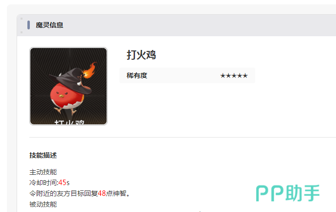 打火鸡:可以让附近的友方成员迅速的恢复48点神智,增加16%的火属性攻击。从外形来看应该就是火鸡的造型,身上就会有火焰一般的元素,比如脚部有火焰环绕