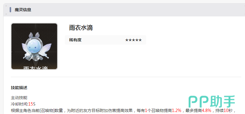 雨衣水滴:每一次有召唤物都可以提高1.2%,最高可以持续10秒提升4.8%,可以给附近有方目标提升伤害的效果,另外还会有16%的水属性攻击。