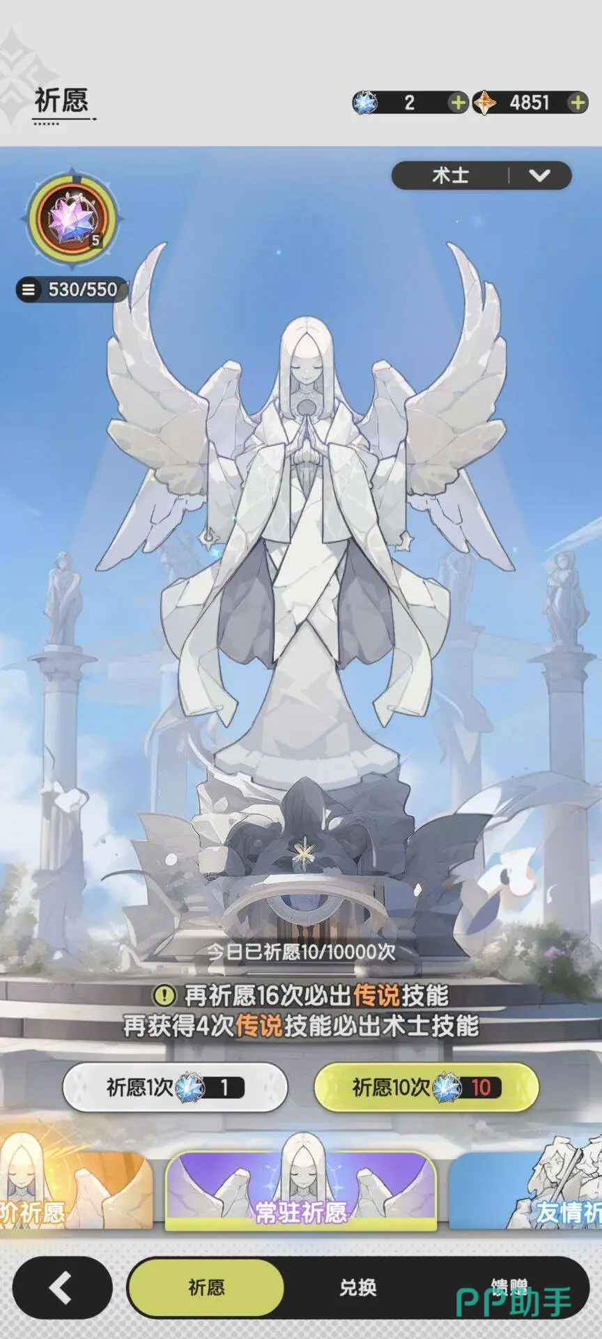 祈愿女神像:抽人物技能,开局官方是给了30抽传说,后续保底就是70抽,建议大家前期打打任务把第一个传说技能抽到。星之愿有10连就直接抽,不要赞,不然战力和进度跟不上的。