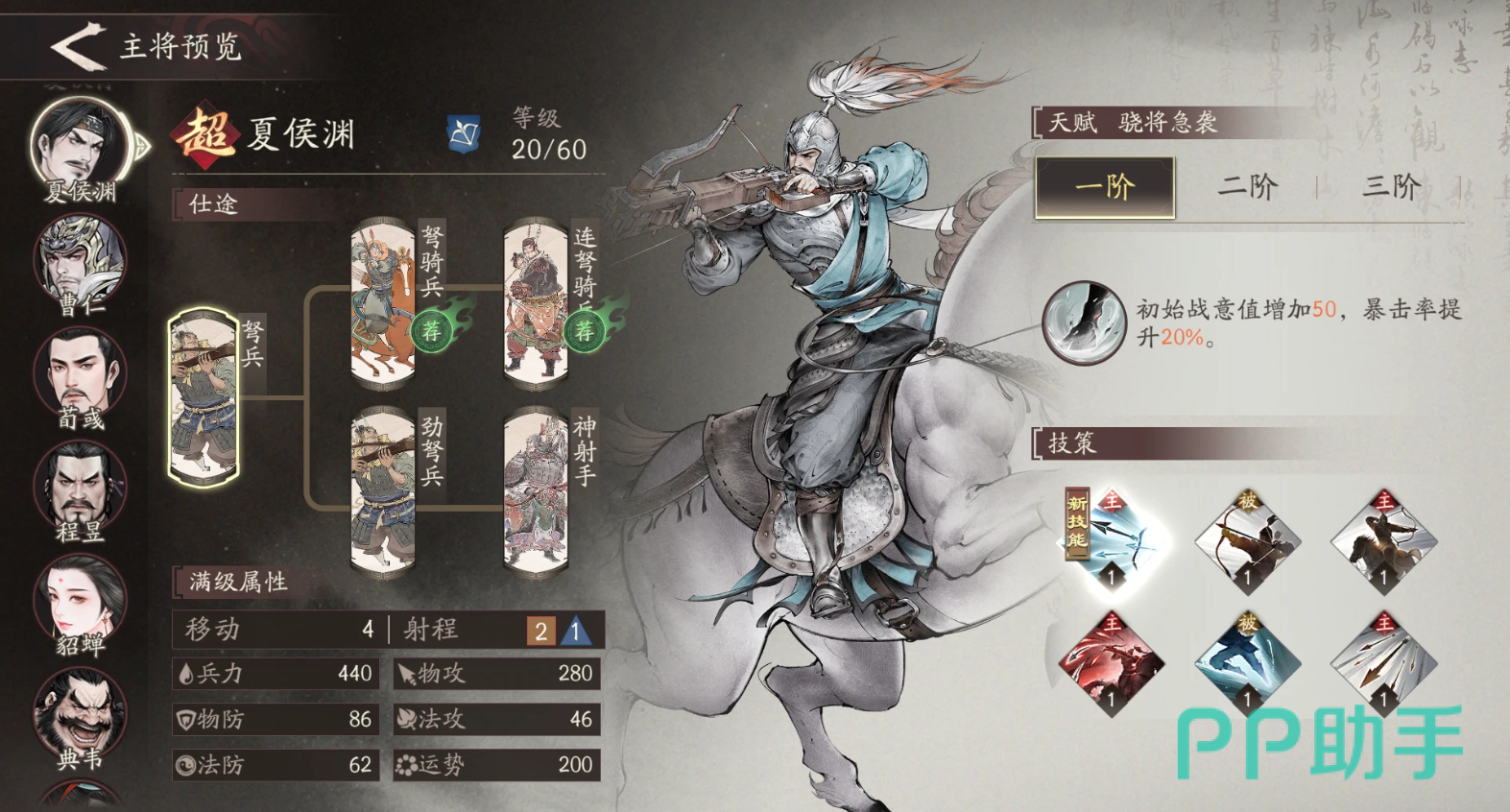 被动“攻其不备”,造成的伤害提升5.6%,普攻后额外赋予目标1层“松懈”。主计策“嘹来止蹄”,赋予范围内我方“冲锋”效果,若是骑马单位额外施加“一骑”,自身的一骑获得加强,主动造成单体伤害前,对武力高于等于智力的单位添加“封技”,并额外对目标造成15%物理伤害。他的技能只要使用得当,甚至能连续四回合隐身,对于新手开荒是非常好用的。