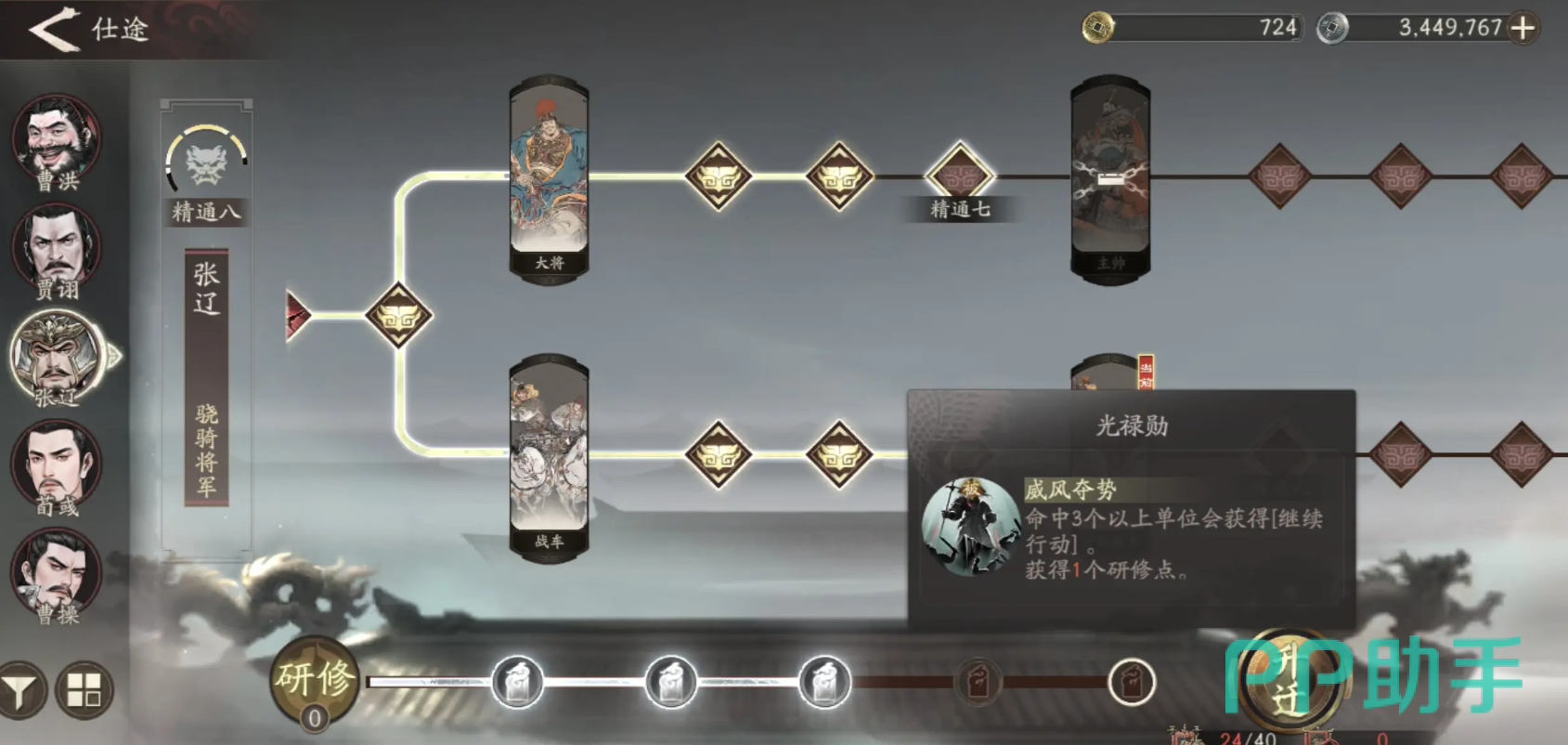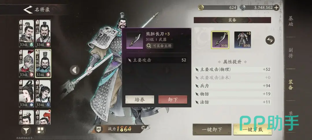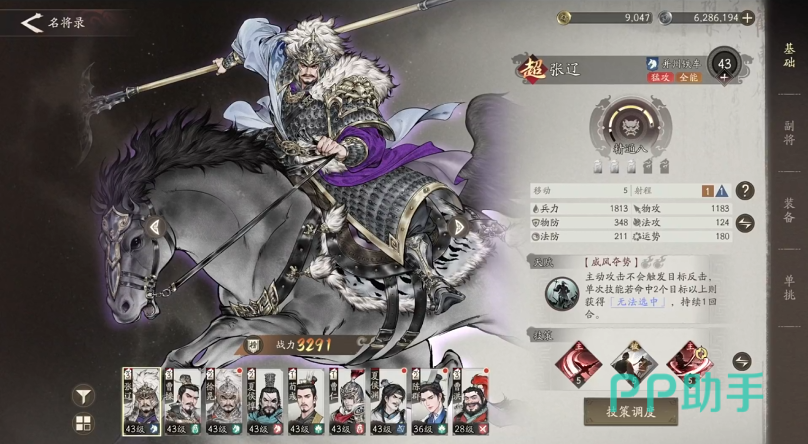 他的技能搭配,比较推荐”短歌行”+”魏武挥鞭”+”振奋”,振奋到后期可以换成“天下归心”,副将的话选择卞氏、邹氏都是不错的;还有种搭配就是”短歌行”+“掠阵”+”魏武挥鞭”,同样后续也是更换成天下归心,这样就是能打出主要的伤害,同时被动还能给友方提供增益的buff,不仅输出伤害高,对于队伍整体的增益也是非常明显的,必练的SSR。