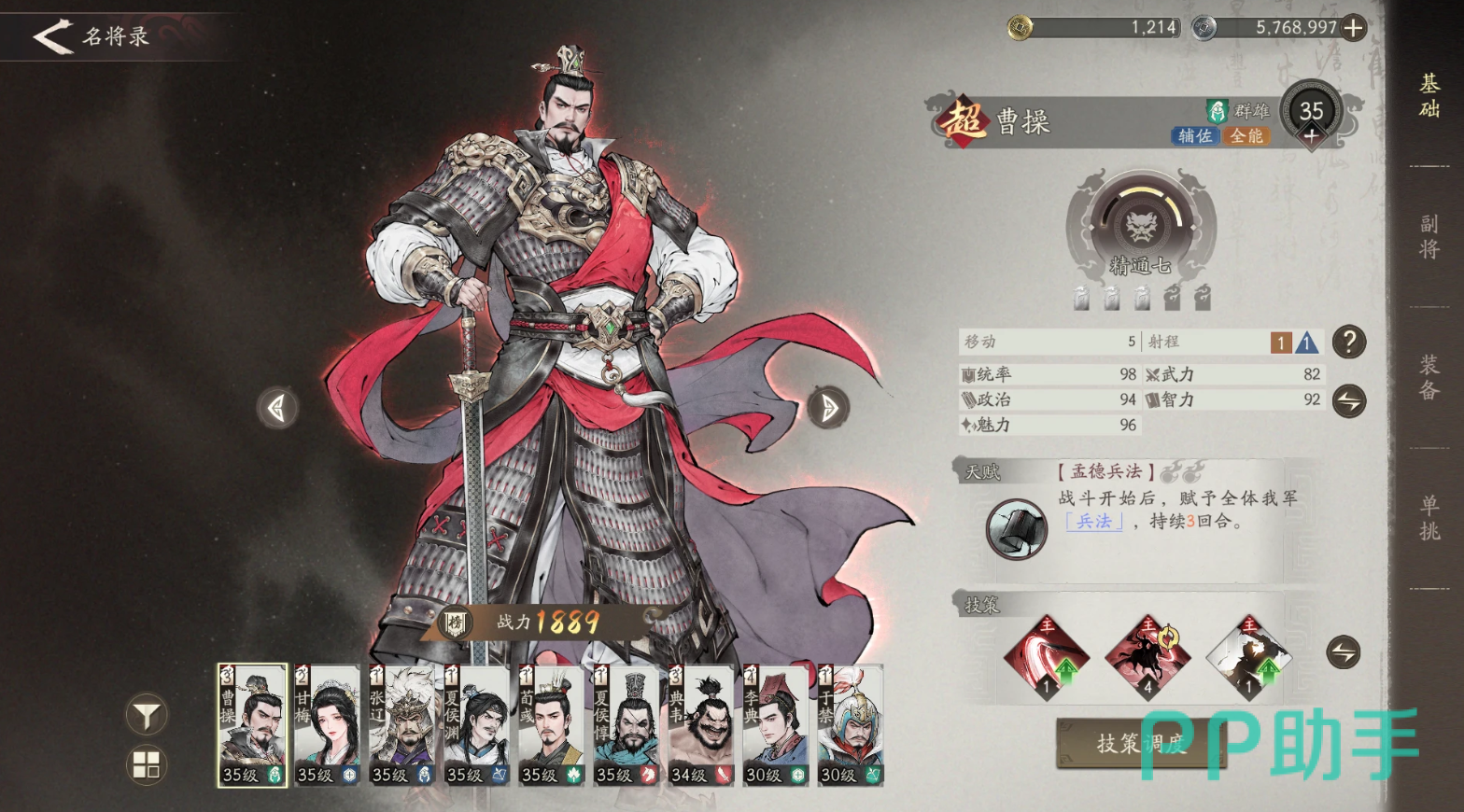 作为SSR来说,目前他是游戏中五维属性最强的,很多的关卡他都是强制上场的武将,而且拥有全图3回合的提高15%的攻防的天赋,还有持续3回合的15%的增减伤,自身就拥有了超强的生存能力,同时还能让友方的属性直接最大化,绝大部分的战斗可以说他都是必然上场的存在。