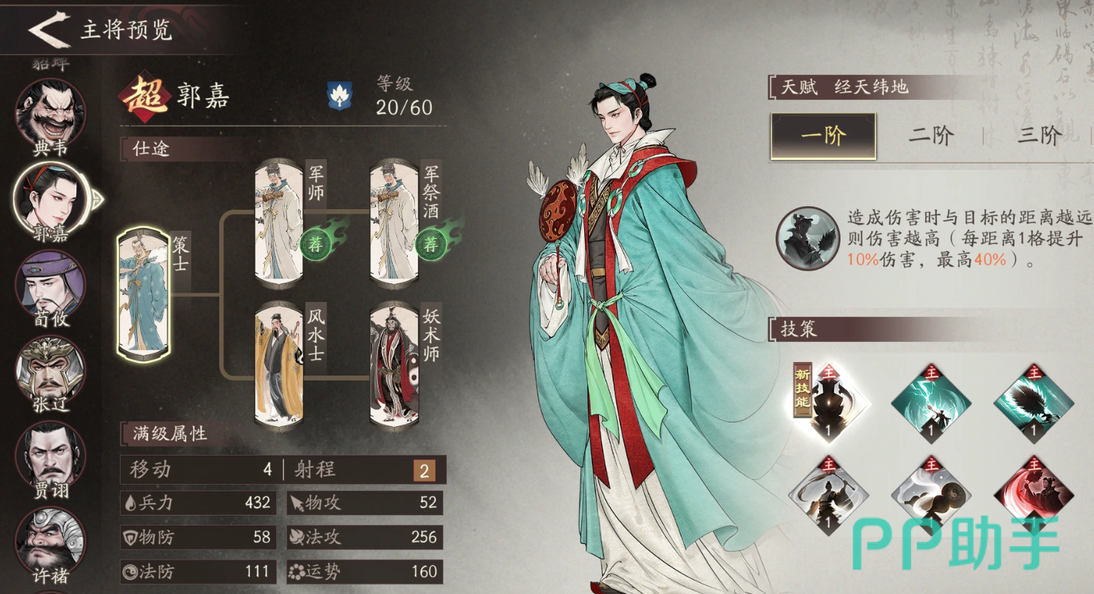 郭嘉的定位策士,他的初始天赋为每次造成伤害时,与目标之间的距离越远则造成的伤害越高,最高可提升至40%,到了二阶还能多一个控制,属于前期可用,越到后期越好用的角色,技能可以搭配谋攻、算无遗策和天妒鬼才,这样打血多的boss会十分简单。