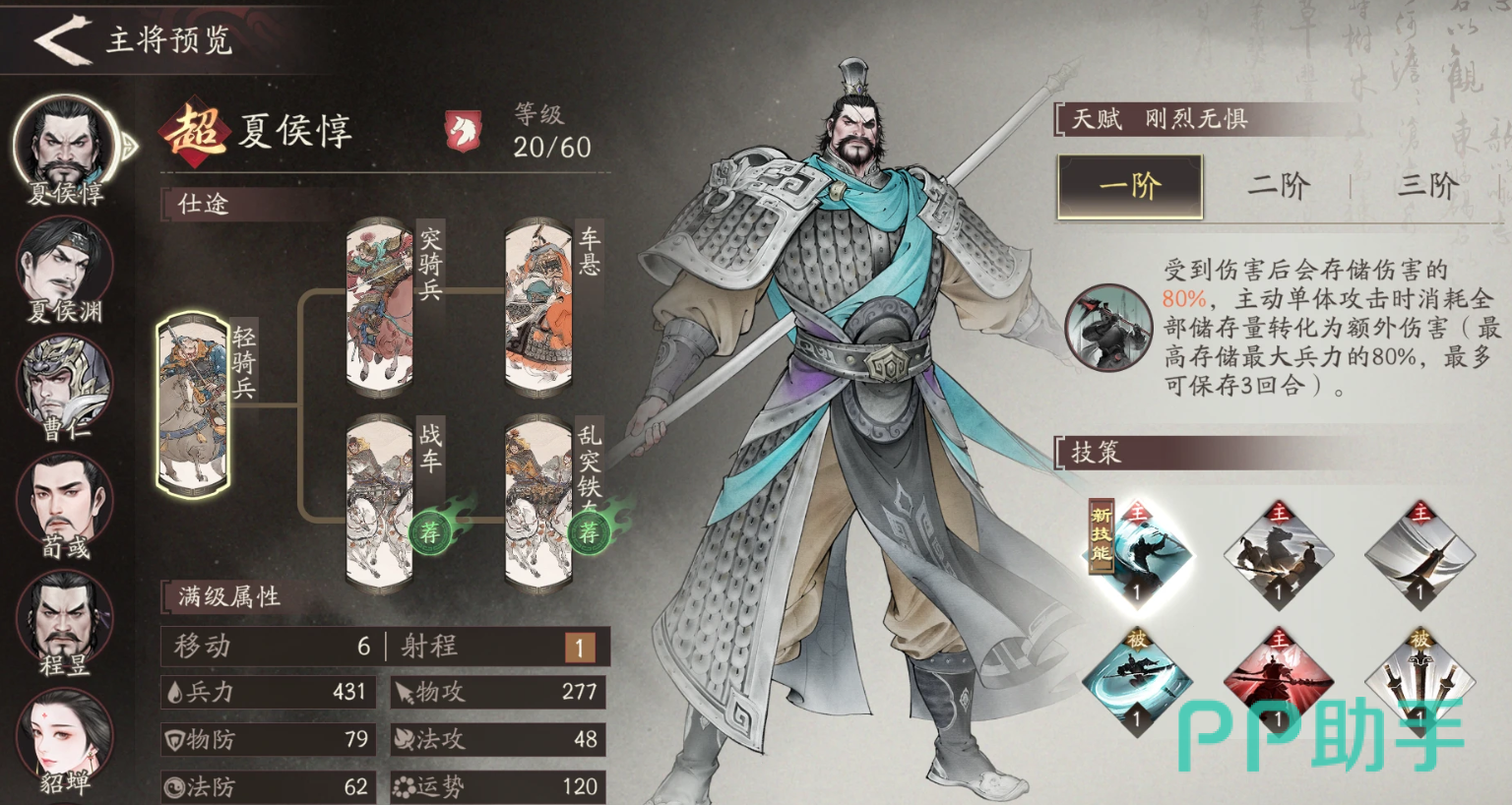 夏侯惇是骑兵,也是剧本初始就会赠送的武将,他的天赋是在被打的时候,对一圈范围内形成伤害,初始技会造成130%单体伤害,并且转移目标10%的免伤,让自身受到的伤害降低10%,被动是在遭受主动伤害后,对普攻范围内的敌军造成46%伤害,额外回复一定兵力的同时,对伤害的来源提升后续输出,简单来说就是能自己回血并且在受伤后会变强,建议给他搭配上雪恨、横刀跃马和突进,走承伤反击的流派。