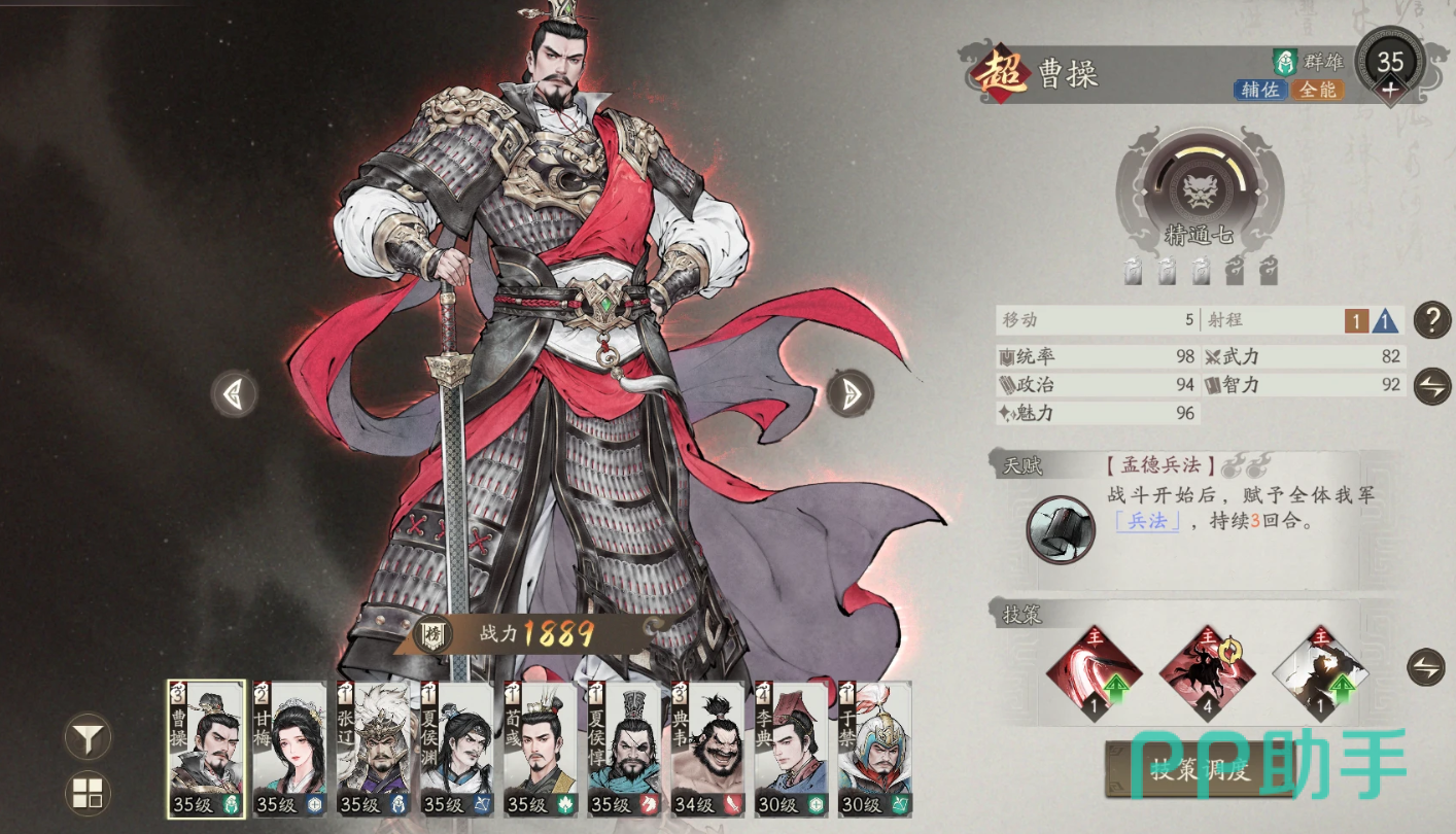 曹操是统帅,很多关卡都会强制上场,他的天赋能够为队友增加15%的攻防能力,并且还能给予15%增减伤,这两个效果范围都是全图,并且持续三回合,这能很好让队友属性最大化,推荐携带的技能有短歌行、魏武挥鞭和振奋。