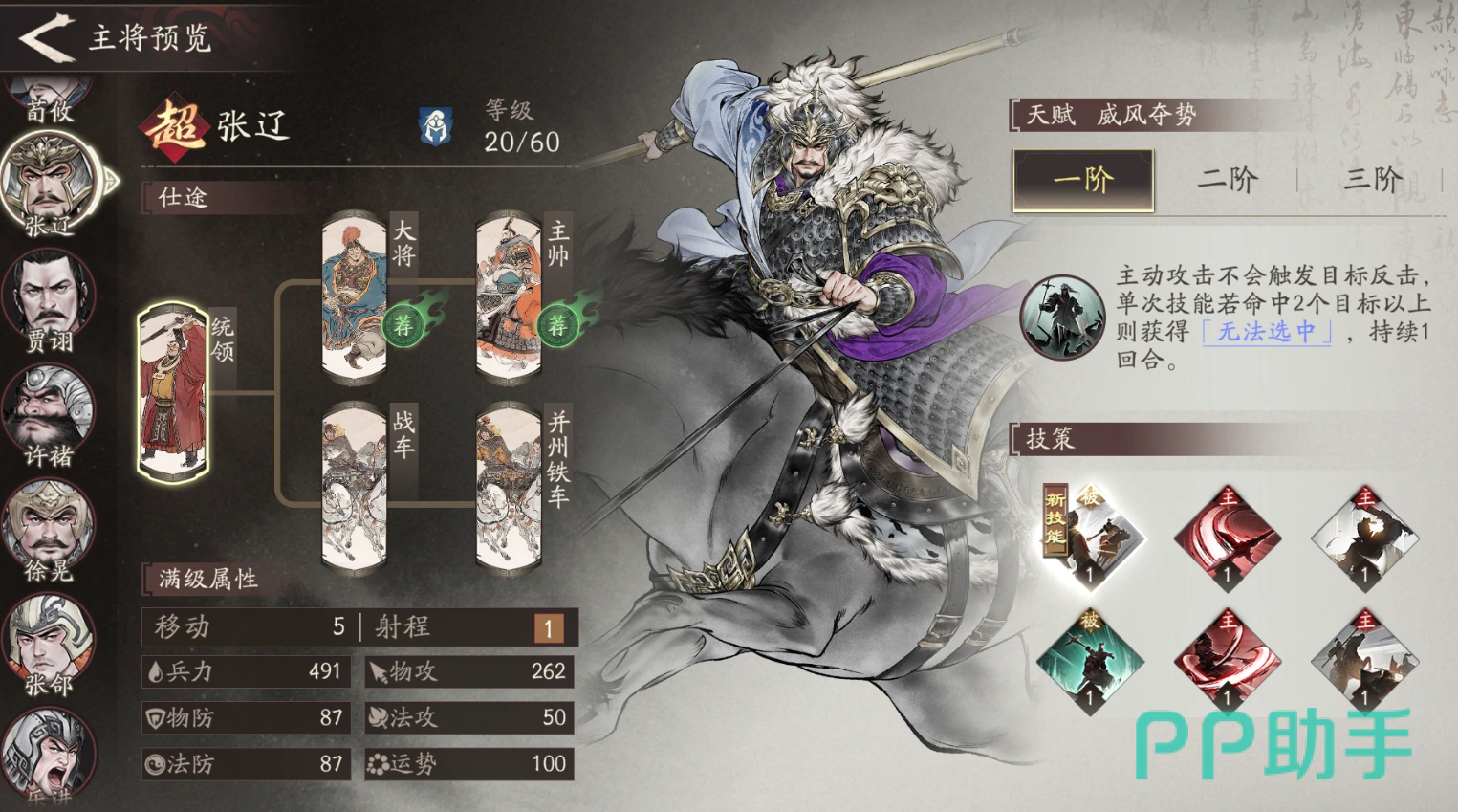 张辽也是一位统帅,他的天赋是主动攻击不会触发目标的反击,单次技能若命中2个以上的目标,还能获得无法选择效果一回合,建议给他搭配上关键技辽来止啼,这个技能可以赋予范围内队友冲锋效果,如果是骑兵单位还能额外附加一骑,将其作为骑兵队核心将有效提升队伍整体实力。