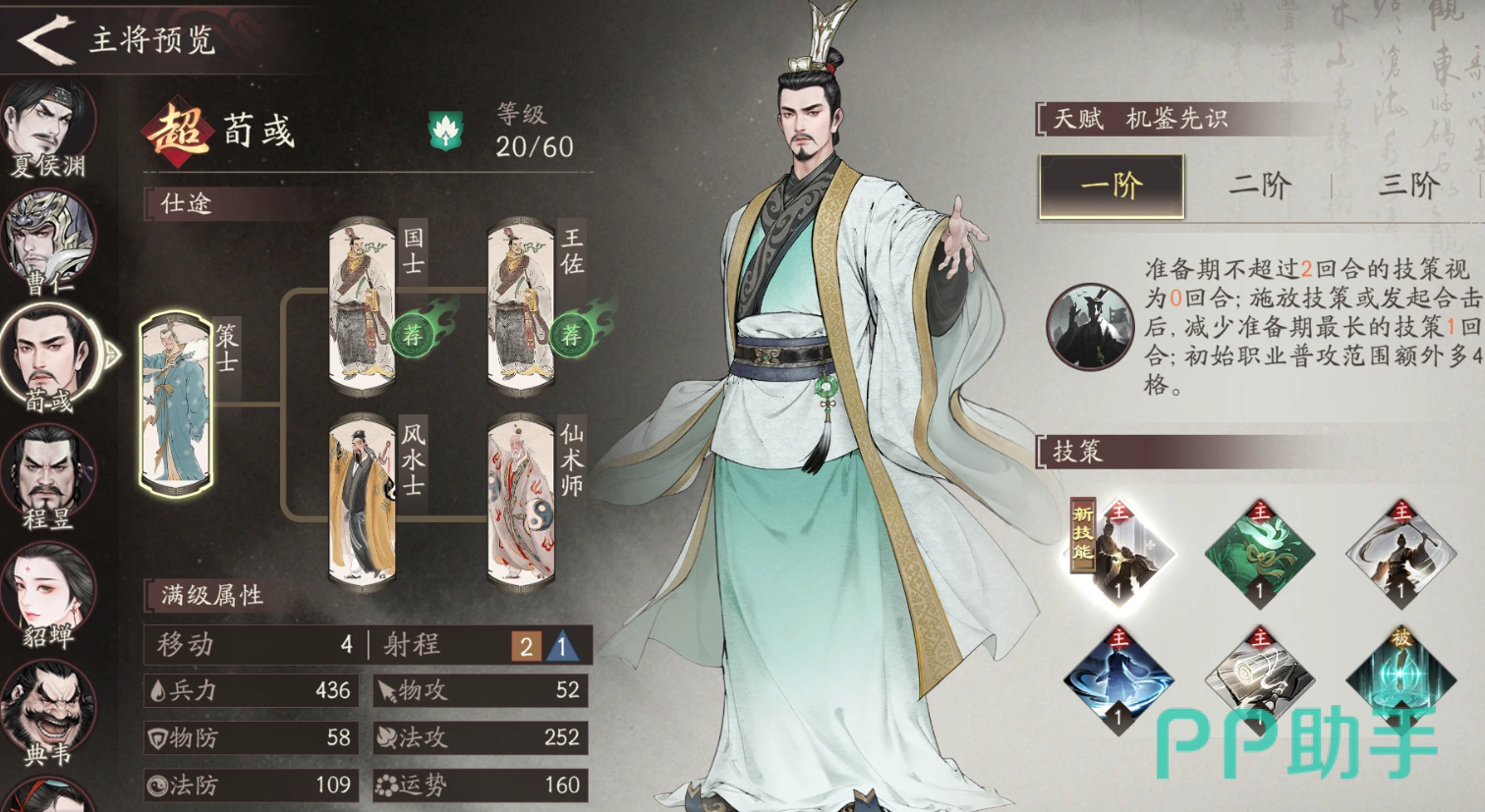 荀彧是策士,可以通过新手七日签到来获取,他能提供治疗并带来多种增益效果,初始天赋是让队友普攻范围增加4格。