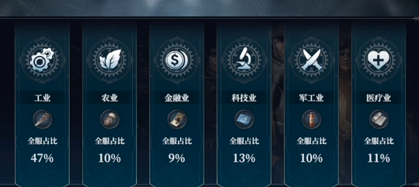 时间来到赛季开启后,在开启后大家需要先进入到自己的赛区页面,在赛区页面大家可以看到全服的发展方向,可以看到各行业的占比,在看到后大家需要做的就是选择最高占比的产业也就是工业。