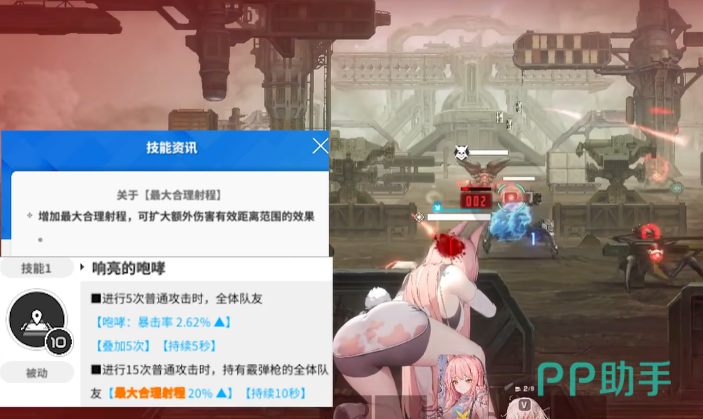 第二个技能是开启爆裂技能以后,所有友方单位的命中率提升百分之20%,同时队伍里两个持有霰弹枪的单位可以发射的弹丸次数增加5,这个技能是直接提高角色的输出倍率,尤其是提升霰弹枪的输出能力,因为霰弹枪的高爆发很大来源于弹丸的数量和命中率,这个命中率提升以后,基本上不会空弹药,这样打对面输出会更加高。